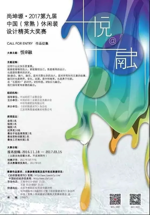 歷屆中國(常熟)休閑裝設計精英大獎賽賽場盛況。 時至今日,中國(常熟)休閑裝設計精英大獎賽的初衷一直未曾改變,那就是挖掘培養新銳設計力量,為紡織服裝行業輸送優秀設計人才。 還有15天,尚坤塬·2017第九屆中國(常熟)休閑裝設計精英大獎賽征稿結束,本月底初評啟動,本年度新秀將在此間誕生。 你還在等什么?馬上投稿吧! |