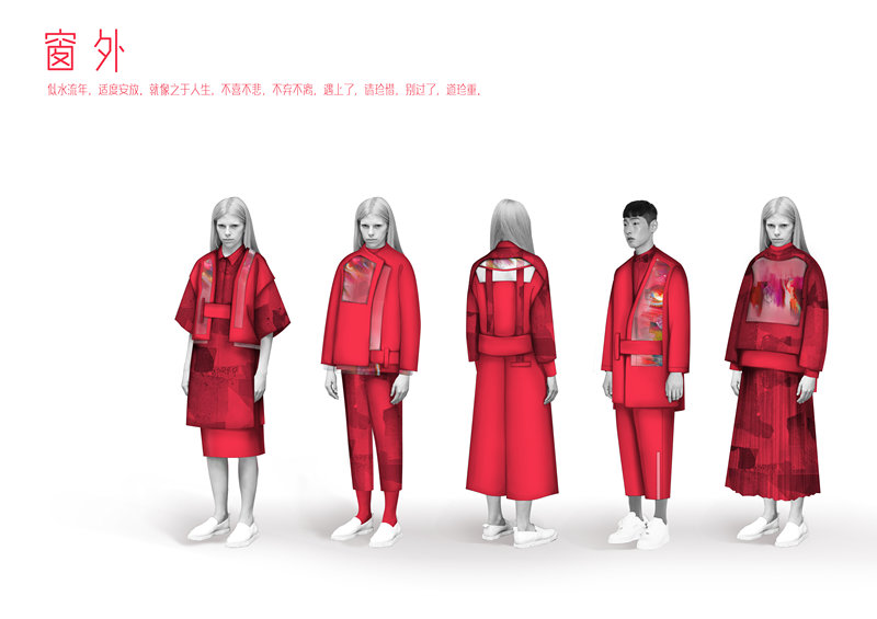 作品闡述;本系列運用如巖漿般的紅色為主色系純粹又明快,這種色調(diào)以一種精力充沛,富有靈動性又兼具潮流感。廓形向長款和疊搭式廓形轉(zhuǎn)變,不對稱和富有層次的細(xì)節(jié)設(shè)計,運用解構(gòu)主義剪裁,全新的形狀通過折疊,垂墜,斜裁的纏裹解構(gòu),寬松簡潔的后背設(shè)計,運用塑膠材質(zhì)pvc精致的壓印增強服裝的視覺效果。