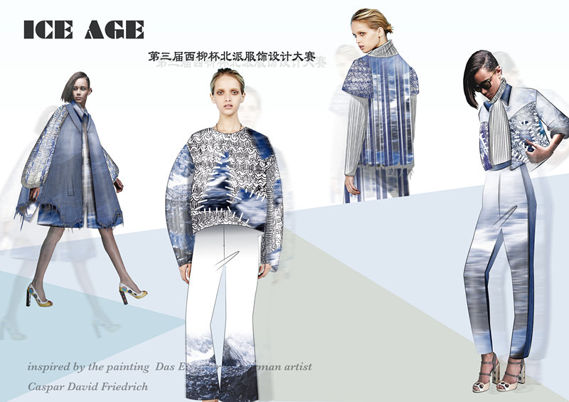 設(shè)計說明:靈感來源于德國畫家Caspar David Friedrich的油畫作品,運(yùn)用冰川作為設(shè)計元素,采用針織,數(shù)碼印花體現(xiàn)冰川的層次感,表現(xiàn)色彩的分層。本系列為創(chuàng)意設(shè)計,但廓形,款式簡單創(chuàng)新點(diǎn)在于將牛仔太空棉等面料裁條進(jìn)行編織。服裝面料歐根紗牛仔太空棉針織毛。