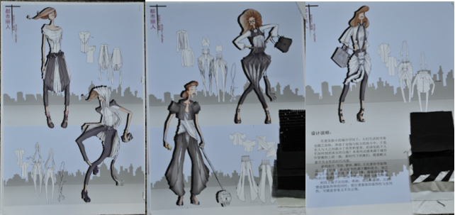 采用亮片、雪紡、蕾絲、鉚釘,大比重的夸張飾品,多元化的色調下的面料組合,加之亮與不亮、透或不透、厚重與輕薄,服裝進行解構、再組合強調在同一色調下的層次多樣與視覺體驗。利用立裁手法切展,堆砌。將面料抽褶、壓褶,塑造服裝形體的同時,更注重服裝的裝飾性與實用性,可隨意穿著又不失正統。