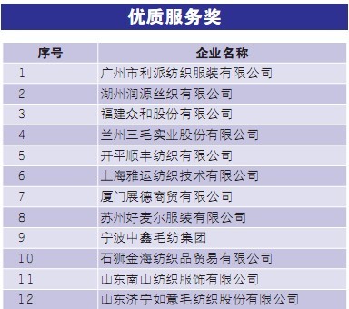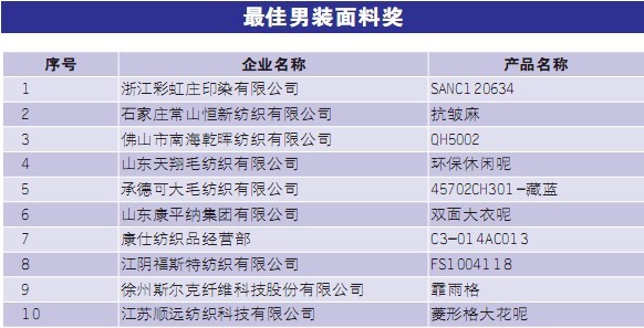 產品征集階段結束后,由國內知名服裝企業采購商代表組成的專業評審小組對產品在工藝、設計、市場暢銷度、性價比等項指標進行了專業評價,最后將用戶評價和專家評價加權平均,產生最終獎項。本年度共有48家企業摘得“中國面料之星”榮譽。