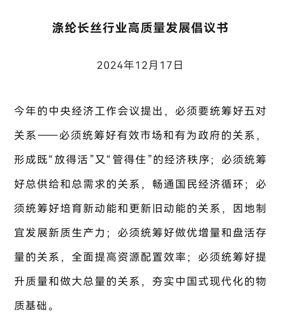 今年6月,中國棉紡織行業協會在新疆喀什召開的2025年中國棉紡織大會上,發布了“共促中國棉紡織行業高質量發展倡議書”。在該倡議書中提到,棉紡行業將穩定棉紡織制造基本盤,保持合理較大產業規模,優化產業布局與產業結構。特別提及行業將全面融入全國統一大市場建設,破除“內卷式”競爭,讓不同地區、不同規模的企業各展所長,共同發展,合作共贏,奉行長期主義,激發創新活力,把更多資源集中到技術創新、產品創新、管理創新上來,促進市場公平,提高發展效能。