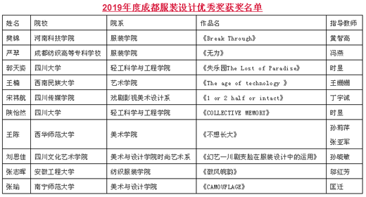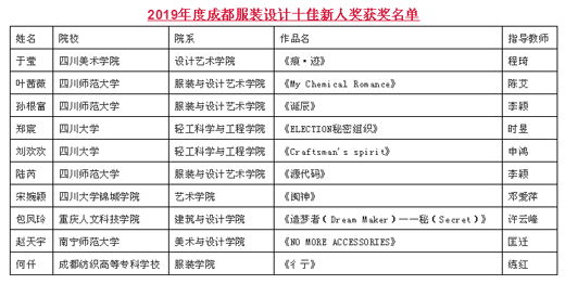 5月31日,“首屆成都服裝設計新人獎大賽”頒獎典禮在“2019首屆中國成都大學生時裝周”閉幕式上隆重舉行。“2019年度成都服裝設計十佳新人獎”、 “2019年度成都服裝設計優秀獎”、“優秀指導教師獎”以及組委會與梧桐珆聯合通過網絡投票評選出的“創意設計獎”、“最佳商業潛質獎”和“指導教師獎”共六大獎項同時頒出。