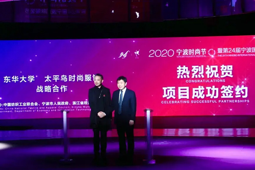 開(kāi)幕式上,東華大學(xué)與寧波太平鳥(niǎo)時(shí)尚服飾股份有限公司簽署戰(zhàn)略合作協(xié)議,寧波大學(xué)、雅戈?duì)柤瘓F(tuán)、申洲國(guó)際集團(tuán)簽署寧波國(guó)際時(shí)尚科技園和寧波大學(xué)國(guó)際時(shí)尚學(xué)院戰(zhàn)略合作框架協(xié)議。中國(guó)服裝協(xié)會(huì)向太平鳥(niǎo)授予“中國(guó)當(dāng)代青年時(shí)尚研究中心”稱號(hào)。 ![]() 東華大學(xué)校長(zhǎng)、中國(guó)工程院院士俞建勇與太平鳥(niǎo)集團(tuán)董事長(zhǎng)張江平簽約。