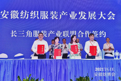會上進行長三角服裝產業聯盟合作簽約,該聯盟由上海市服裝行業協會、浙江省服裝行業協會、江蘇省服裝行業協會、安徽省紡織行業協會牽頭發起,組織三省一市的紡織服裝骨干企業、行業服務機構、專業院校和科研機構成立長三角服裝產業聯盟。現場同期舉行安徽省紡織行業協會與產業集群合作簽約,繁昌區、瑯琊區、霍邱縣、東至縣等地紡織服裝投資項目簽約儀式。
