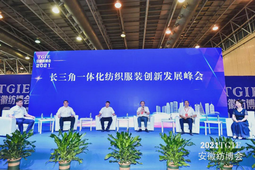 在長三角一體化紡織服裝產業創新發展峰會上,中國紡織工業聯合會副會長孫淮濱作為引言人,與中國紡織建設規劃院院長、浙江省服裝行業協會會長馮德虎,江蘇省服裝協會常務副會長龔慧娟,上海服裝行業協會會長朱勇,安徽紡織行業協會執行會長葉梁,瑤海區人民政府副區長鄭嘯就加速推進長三角產業一體化進程,推動紡織服裝產業高質量發展展開深入研討。