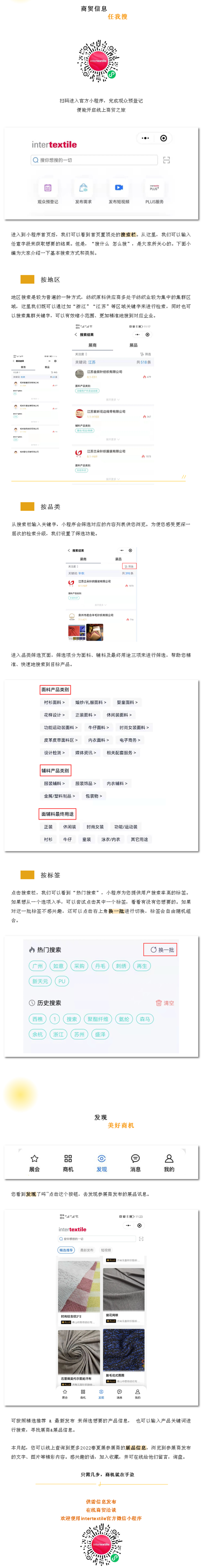 在intertextile面輔料展的PLUS數字化服務中,“官方小程序”作為線上服務工具,輕量化,操作簡便且商貿效果佳。作為intertextile的老粉和新晉粉絲,使用好小程序能為您帶來更好的參展以及觀展體驗。目前,2022春夏展參展商線上展位已經陸續搭建上線。這一期小編帶您詳細看看如何利用“官方小程序” 與他們“遇見”。