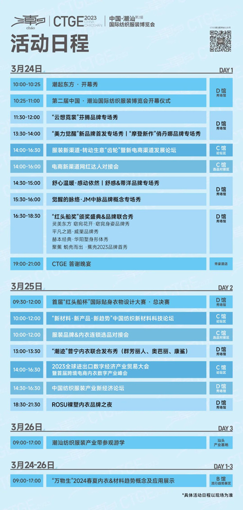 特邀知名經濟學家吳曉波及多名行業大咖、專業機構作為主講嘉賓,分享行業干貨,包括中國紡織服裝產業新經濟論壇、服裝新渠道-轉動生意“齒輪”暨新電商渠道發展論壇、新材料·新產品·新趨勢暨新材料科技高峰論壇、2023全球進出口數字經濟產業貿易大會暨首屆跨境電商內衣數字產業峰會,四大主題論壇一觸即發,聚焦發展商機,提供行業最新變革,打造頂級行業話題探討。