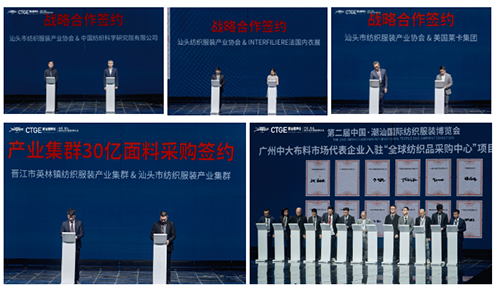 ![]() 開幕式上,進行了多場簽約儀式,中國紡織科學研究院有限公司、Interfiliere法國國際內衣暨泳裝面輔料展、萊卡集團與汕頭市紡織服裝產業協會戰略合作簽約。晉江市英林鎮紡織服裝產業集群與汕頭市紡織服裝產業進行30億元的面料采購簽約,廣州中大布料市場代表企業入駐汕頭進行“全球紡織品采購中心”項目簽約。
