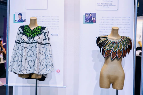 回收服裝、床單、甚至輪胎內胎,在中國紡聯秋季聯展的展示空間“再生云裳·PARURES可穿戴再生藝術展”上,各種回收再造的藝術品顛覆想象。該展示是社責辦聯合法國環境與能源控制署舉辦的“衣心向善-中法可持續時尚系列活動”的一項重要內容。Parures在法國傳統中指佩戴在頭頸的成套裝飾品,類似中國的云肩。本次藝術展則是對“可穿戴藝術”這一概念的革新性詮釋。