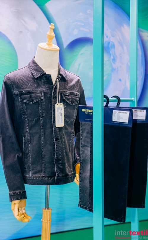 在2023中國紡聯秋季聯展活動中,CHIC-可持續創新專區通過CNTAC-LCA產品碳足跡展覽對LCA測算典型產品進行展示。展示了森馬針織褲、安莉芳文胸與低碳糖果褲、歌力思連衣裙、勞芮連衣裙、七匹狼男裝牛仔茄克等典型案例。以一件男裝夾克為例,其生命周期的數據核算邊界從搖籃到大門,數據涵蓋了萊賽爾纖維、棉纖維、散纖維染色、紗線生產、面料制造、服裝縫制等各個生產環節。