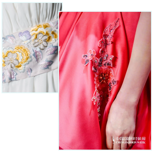 ![]() 她將中國傳統特色服飾旗袍和西式禮服作為設計研究對象,在東西方文化碰撞下進行創新設計,不僅展示了高定服裝獨特的設計和優雅的風韻,也展示了苗繡、潮繡手藝人傳統服飾制作的精湛技藝。