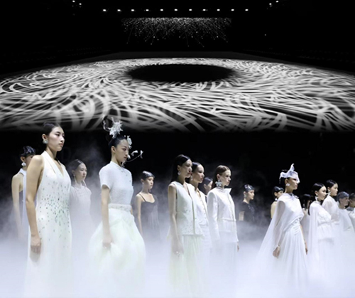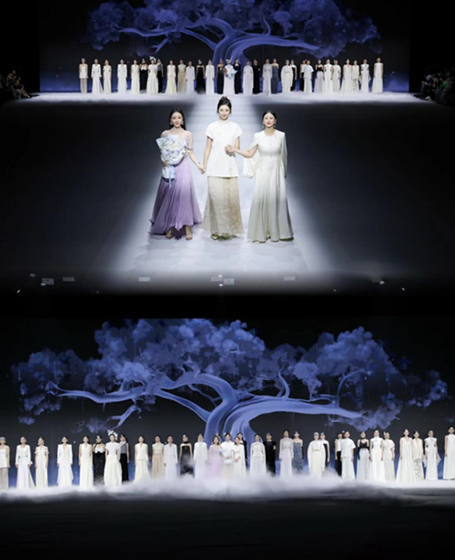 在整場秀中,品牌以白色締造了絕對安靜的環境,從白色的有限中觀察到世界無限運動的狀態,從簡單到復雜,再到去魅之后的真實。NUNU NONO『白上之白』以白色為始,從宇宙的浩瀚無垠之中誕生萬物,順應自然,呼應“無為”的思想哲學核心——順應自然規律。而后以大樹為背景致敬自然之美,將東方文化的精神核心通過傳統廣繡工藝躍然服裝表達之上,在場所有時尚人士、明星、各國使節夫人們無一不為其矚目。NUNU NONO還巧妙布局秀場,通過音樂、薄霧光影、色彩變化等,講述關于人生「看山是山」、「看山不是山」到「看山還是山」三重境界的故事,營造了一個充滿詩意與哲思的秀場氛圍。整個系列仿佛一場關于生命、自然與文化的對話,引導觀眾在視覺與心靈的雙重震撼中,重新審視東方美學的獨特價值。