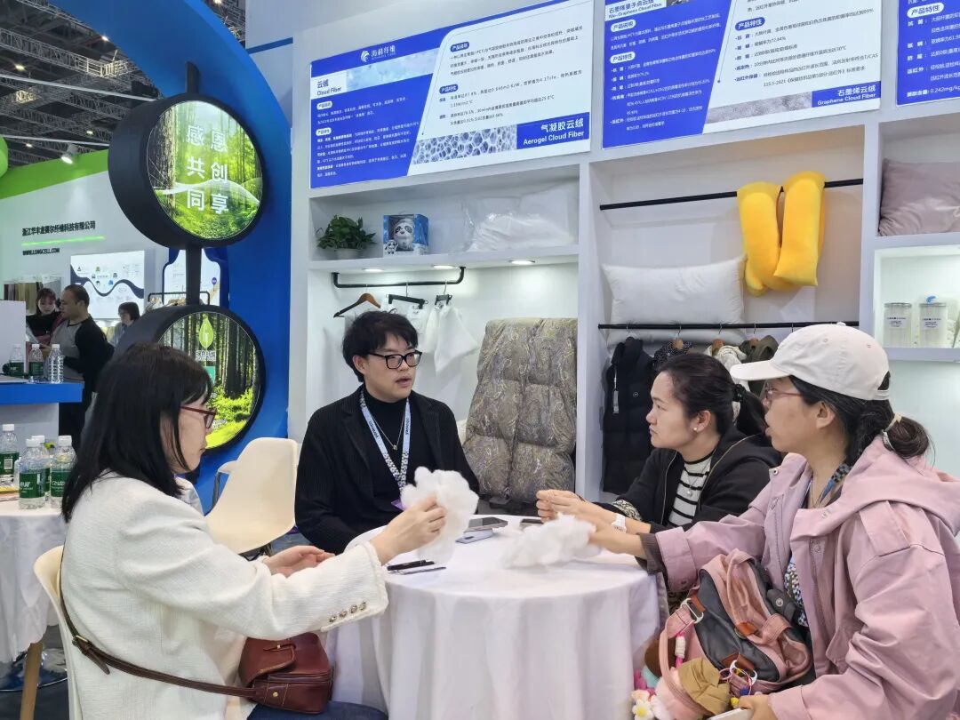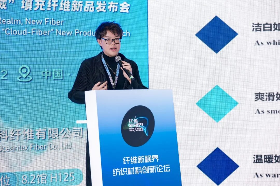 ![]() 江蘇海科總經理李辰昊詳細介紹了“云絨”系列四大核心產品:石墨烯云絨、氣凝膠云絨、姜暖云絨、仿生發熱絨,聚焦輕質鎖溫、主動健康、抑菌驅螨、遠紅外保健、仿生發熱等方向,標志著再生填充纖維從“低端填充料”向“高端功能性材料”的躍升。