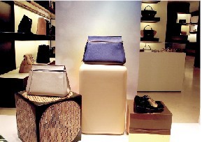 ![]() 櫥窗里簡化到有些像公文包式的手包,是品牌風(fēng)格的具體體現(xiàn),連櫥窗的布置也有一種干練的感覺,三個材質(zhì)各異的方形展示臺是櫥窗唯一的裝飾品。