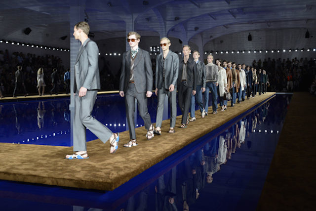 2016春夏米蘭男裝周,有人關注男模的顏值,有人關注男裝的顏值,但亦有不少人會被各式各樣的時裝秀場設計所吸引。近年來,包辦了Prada每一季秀場設計的AMO團隊這一次又帶來新作。 說到AMO你可能會感到陌生,但造過央視總部的建筑師雷姆 庫哈斯(Rem Koolhass)你多少應該聽過。他是大都會建筑事務所(OMA)的創(chuàng)始人,之后又成立了AMO,主要針對媒體、科技、藝術等議題提供策略與原創(chuàng)的改變,同時也關注建筑與人類行為、商業(yè)、文化的關系,簡單來說,AMO更像是庫哈斯的智庫。 此前,AMO 就曾在 Prada 的秀場上大玩出其不意,有的是與每一季最新系列形成強烈反差的概念,有的則是呼應新一季主題的設計。比如去年的春夏男裝發(fā)布秀場,AMO 為 Prada 設計了一個大型的水池,水面周圍以棕色地毯環(huán)繞,模特的走秀臺則延展至冷色調(diào)的藍寶石靜態(tài)水面。又如2015春夏秀場上的室內(nèi)沙丘與2015秋冬女裝秀場上的紫色沙丘與綠粉相間的房間,以響應設計師為當季秋冬系列注入的宛若春夏般甜美粉嫩的色彩。
