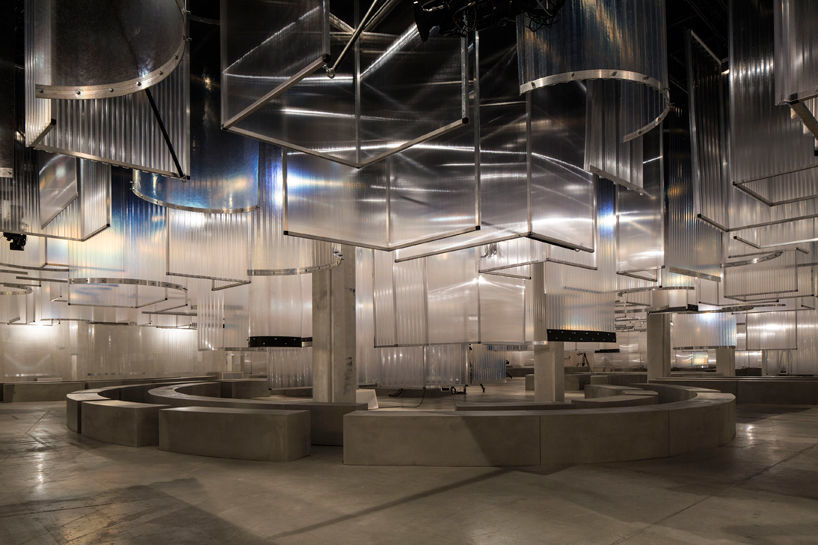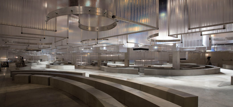 這一次,AMO要玩的是觀者對于連續(xù)轉(zhuǎn)換空間的一種特別感知。設計團隊在天花板上懸吊了各式彎曲的筆直的透明塑料布,渲染出一種飄忽的模糊感,而與之對應的則是地面之上敦實的混凝土彎曲長椅,連帶著光潔的混凝土地面一同襯托出整體空間的工業(yè)氛圍,喚起一種永無止境的飄渺感,其中夾雜著Prada這一季后現(xiàn)代朋克風的一絲味道。