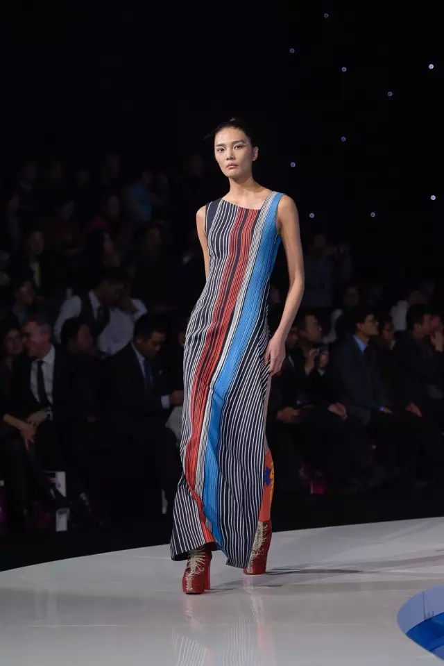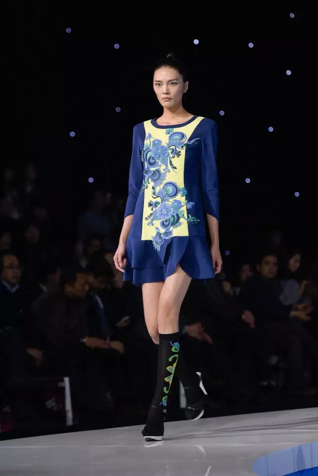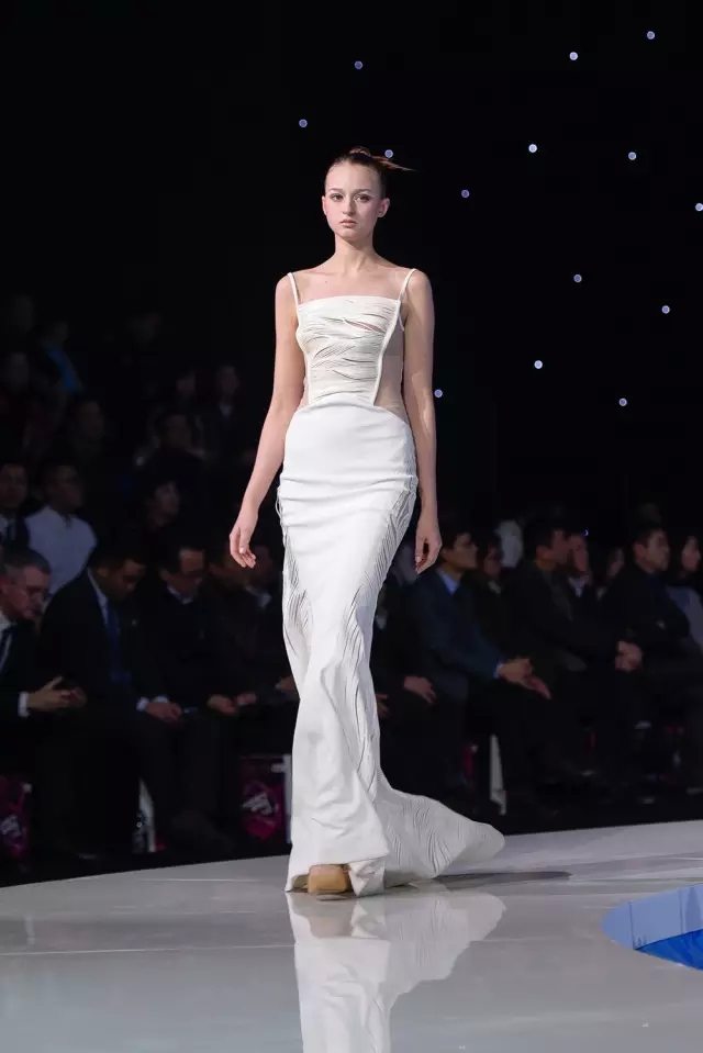 水是武漢這座城市重要的價值符號,當這個以湖泊為輪廓的舞臺如藍色的絲帶緩緩亮起,仿佛承載了這座百湖之城的一個夢,裊裊從深處向人們走來。這就是第四屆武漢國際時裝周開幕秀的主會場。 當模特緩緩步向水邊之時,曼妙姿態讓觀眾瞬間著迷,秀場內只剩悠然樂聲。10日晚的開幕大秀由武漢裕大華紡織服裝集團作品發布秀、中國金頂獎設計師劉薇作品發布秀,和大岸堂·素衣綴墨藝術秀三場共同組成。