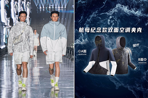 ![]() 同樣具有雙面屬性和防曬功能的“空調夾克”,“A面”為低調簡約的素色拼接,“B面”滿印航母元素印花,將不同的風格調性集于一身,更符合都市年輕人隨性而至的穿衣風尚;而另一款可脫卸袖夾克也融合了長短袖兩種不同穿法,讓消費者可以隨心變換時尚造型,享受夏日戶外陽光。