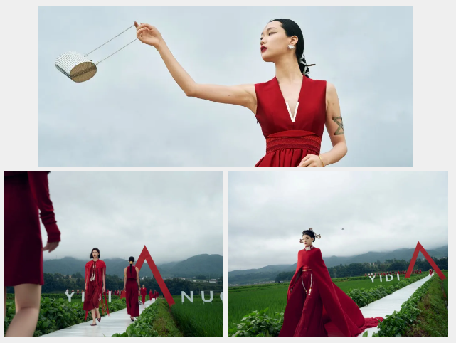 ![]() ![]() 衣迪阿諾2024時裝大秀整個秀場稻香四溢,流水潺潺。在古老的彝族民歌聲中,數十名模特佩戴品牌銀飾、身著首秀作品款款而來,穿越扎根田野的紅色大門,一次次驚艷全場。這是一場將時裝寄情于當地人民生活場景中,融合自然生態、當地文旅、民族藝術于一體的實景大秀。