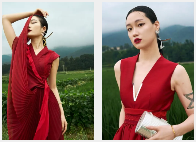 ![]() ![]() “此時正值彝族傳統節日火把節,紅色正好契合此時此刻的氛圍,在前期構思中,我們嘗試用更為綠色、低能耗的植物染技藝以彝族服飾為媒介進行創新,傳播綠色設計理念,并將百褶、流蘇、彝族傳統紋樣等元素應用現代時裝設計中。”談及創作時阿牛阿呷說。