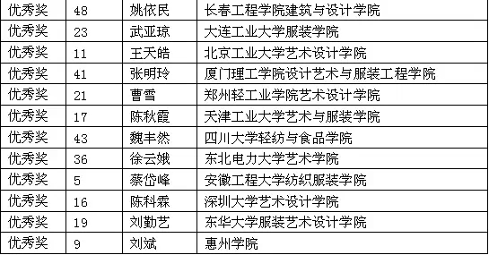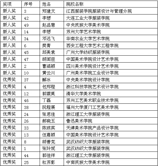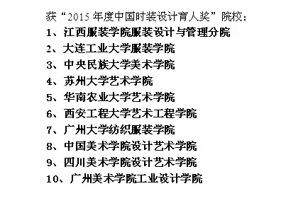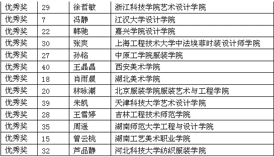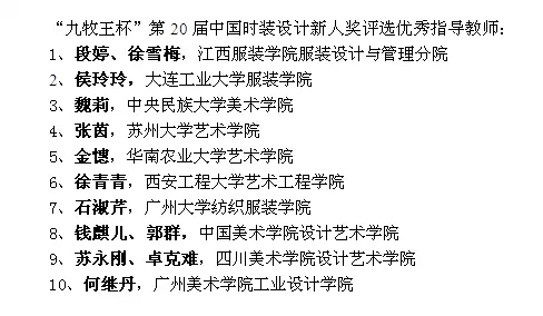 據統計,近年來隨著推薦優秀畢業生參評的時裝院校逐年增加,“新人獎”評選累計接收全國時裝設計院校推薦的優秀畢業生達8800人次,經過激烈角逐與評選,共計655人次進入終評,其中164人獲得“新人獎”。“新人獎”不僅成為時裝設計專業大學生就業及自主創業的助推器,更成為促進時裝設計專業教育進步,檢驗高校時裝專業教學水平的標桿,甚至影響著時裝專業教育和教學改革的發展方向。 “九牧王杯”第20屆中國時裝設計新人獎名單