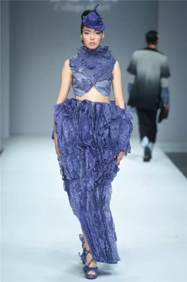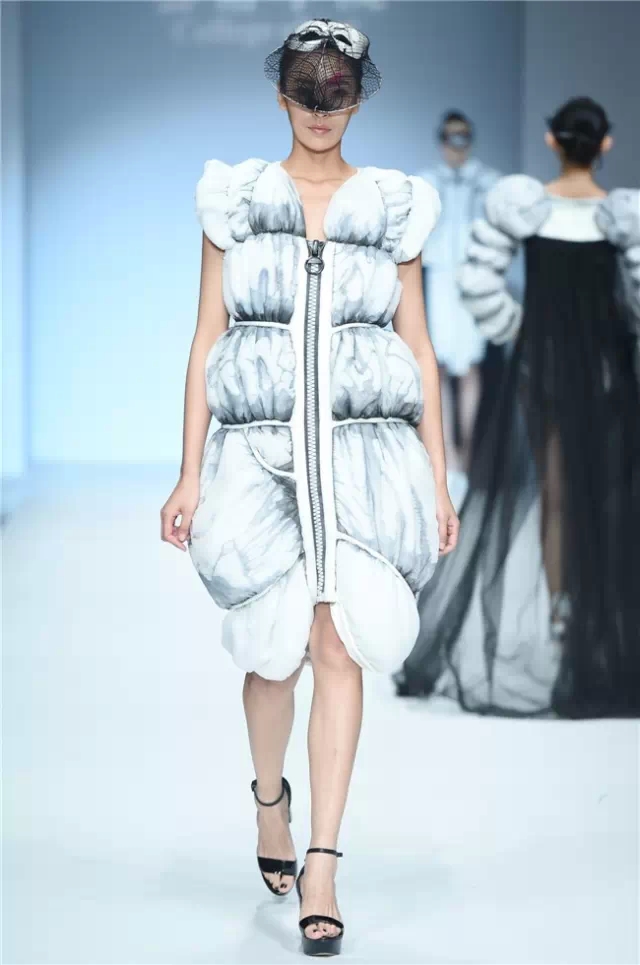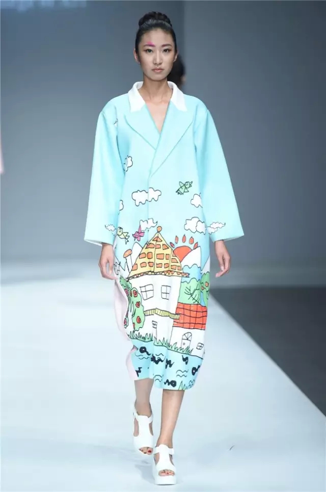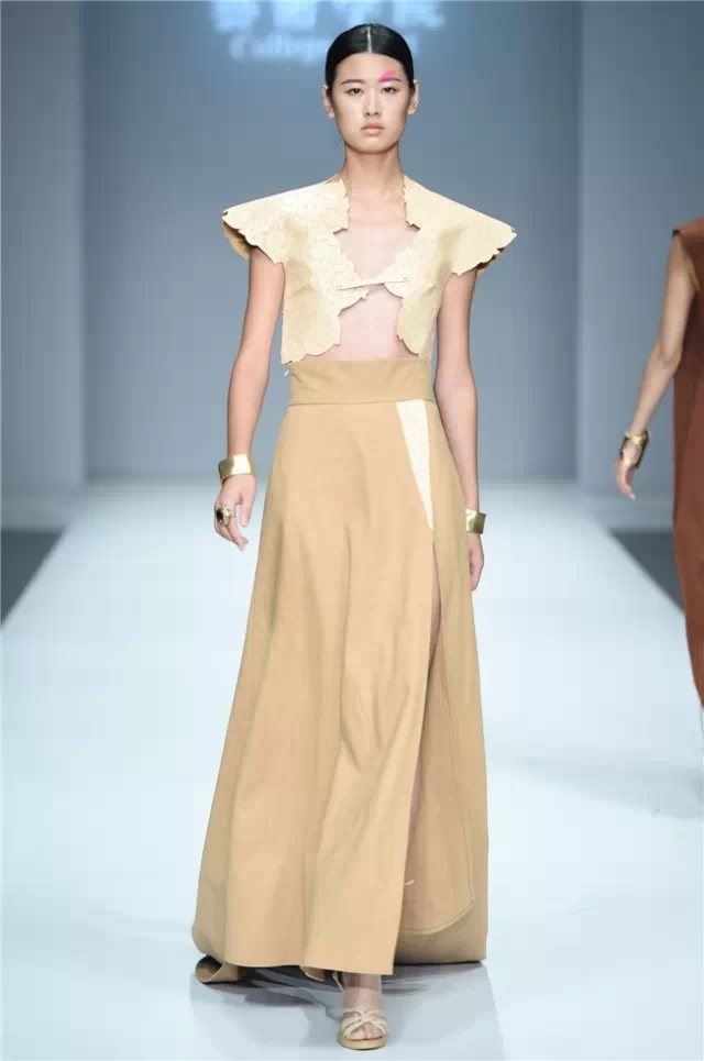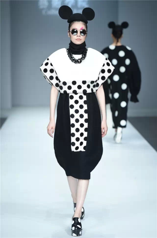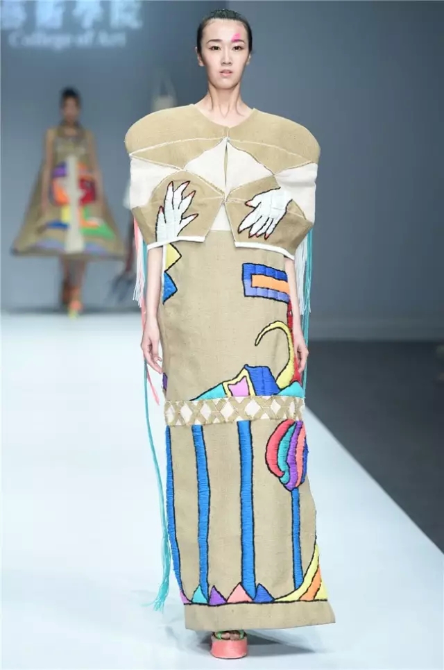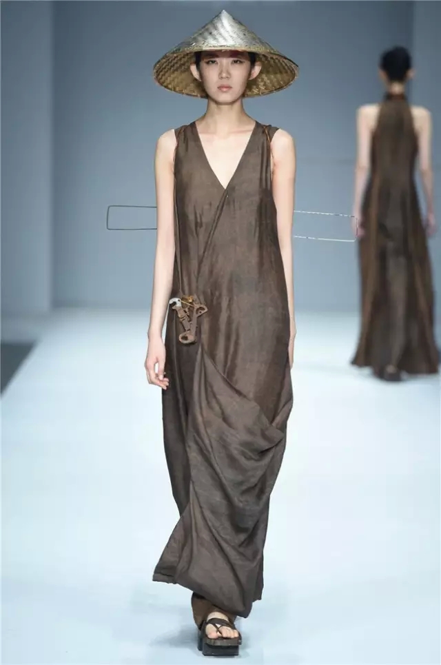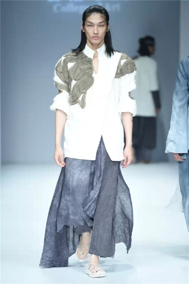華南農業大學藝術學院的學生作品的主題是“初·格”,展示了25名畢業生的60套服裝設計作品。本場發布會作品以淡然超脫的氣質,從最原始、最安靜的內心出發,探究衣物的本來面貌,尋找衣與人最自然的關系。既不為流行所左右,也不被傳統所束縛,在單純、原始、超然的狀態下,從中國傳統文化中尋找設計的靈感。 古韻情懷讓這場嶺南風情秀展現了儒家的厚重感。當草鞋、斗笠、木屐等元素一一出現時,江邊的漁女、竹林間的隱士、沙漠中的獨行人等形象立刻豐滿了起來。荷花等常用的傳統符號元素在學生的運用下靈韻而又不失古樸。在現代部分,俏皮的廣式小格調融合著波點和畢加索式涂鴉,展現了對傳統的“反叛”。 從初格到出格,從內斂到釋放,學生們完成了一次執著的設計之旅。