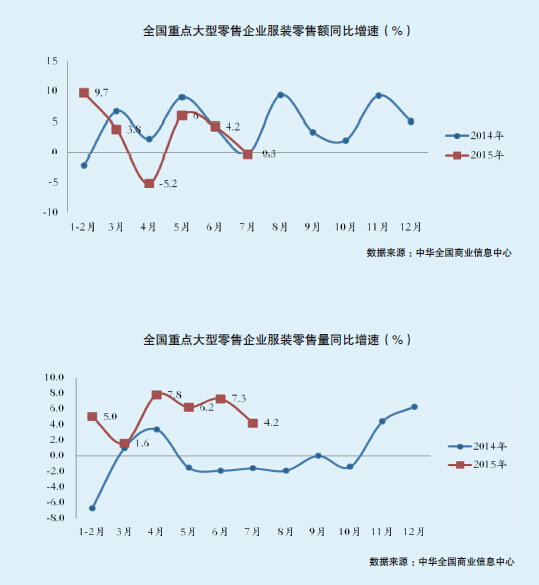 根據中華全國商業信息中心的統計,2015年7月,全國重點大型零售企業服裝零售額同比下降0.3%,各類服裝零售量同比增長4.2%。