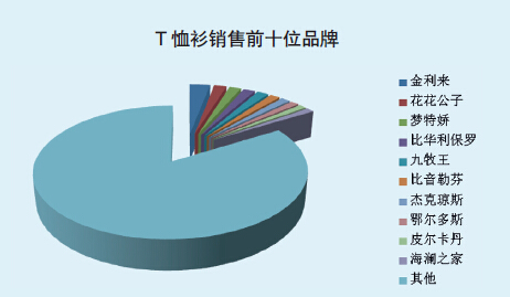 根據中華全國商業信息中心的統計,2015年7月,全國重點大型零售企業T恤衫銷售前十位品牌市場綜合占有率合計為16.20%,金利來、花花公子和夢特嬌占據前三位。