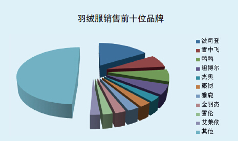 根據中華全國商業信息中心的統計,2015年7月,全國重點大型零售企業羽絨服銷售前十位品牌市場綜合占有率合計為50.68%,其中,波司登、雪中飛和鴨鴨占據前三位。