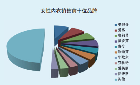根據中華全國商業信息中心的統計,2015年7月,全國重點大型零售企業女性內衣銷售前十位品牌市場綜合占有率合計為50.73%,其中,曼妮芬、愛慕和安莉芳占據前三位。