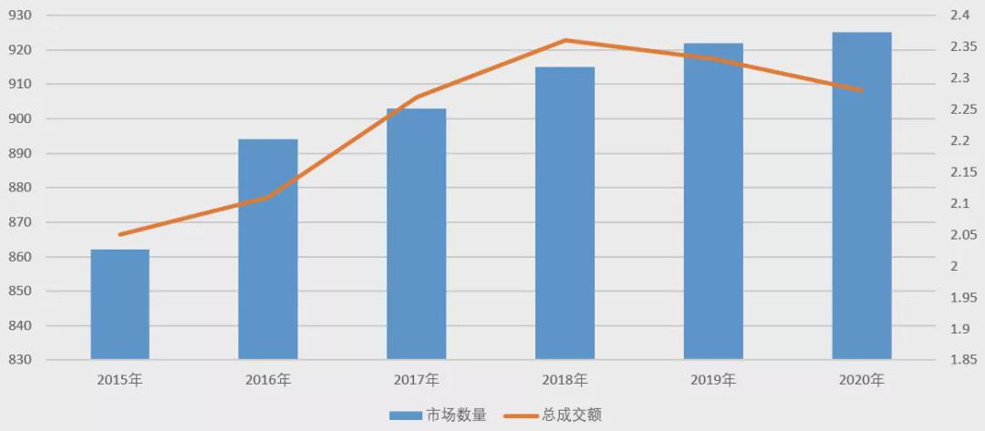 成交額增速方面。2015-2020年,專業市場總成交額年同比增速依次為2.11%、2.81%、5.12%、3.85%、-1.08%、-2.22%,增長速度逐步放緩,自2019年起出現連續兩年的下降。