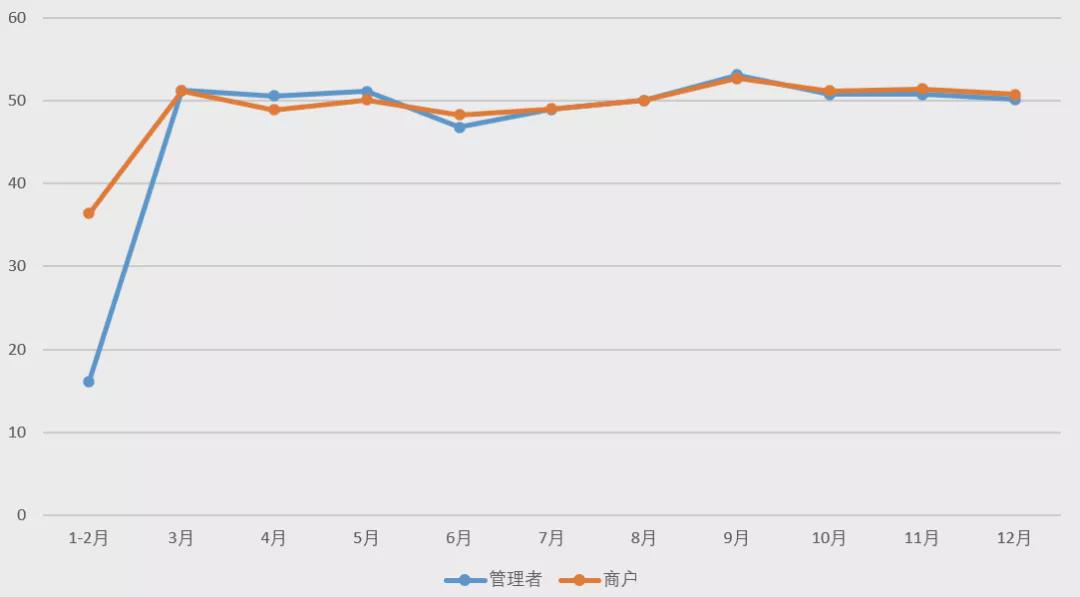 景氣方面。2020年,紡織服裝專業市場管理者景氣與商戶景氣走勢基本一致。1-2月,受新冠肺炎疫情影響,全國紡織服裝專業市場景氣跌至歷史最低點;3月份,隨著疫情防控工作的穩定鋪開和各地復工復產的有序推進,景氣指數開始回升。但是,上半年專業市場景氣指數不斷出現反復,市場管理者與商戶對市場運行情況和未來發展的信心不足;下半年,我國紡織服裝專業市場迎來全年的銷售黃金期,線上線下融合發展、內貿外貿融合發展、批發零售融合發展,實現了銷售額的逆勢增長,景氣指數穩健回升。2020年,專業市場管理者景氣指數全年平均值為43.31,商戶景氣指數全年平均值為45.02,兩項平均數均低于50榮枯線,相較2019年有所下滑,商戶景氣指數略高于管理者景氣指數。