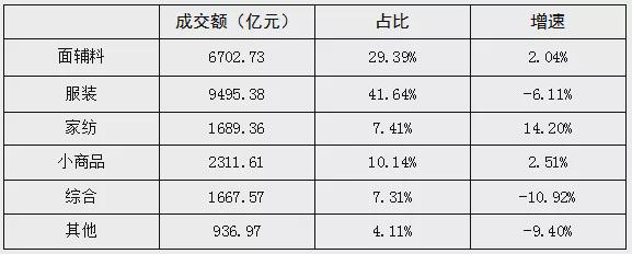在全國服裝類專業市場中,東部地區市場成交額同比下降2.09%,中部地區市場成交額同比下降17.12%,西部地區市場成交額同比下降18.05%;在全國原面(輔)料類專業市場中,東部地區市場成交額同比增長2.05%,中部地區市場成交額同比增長2.00%,西部地區市場成交額同比增長1.13%。