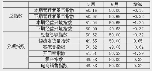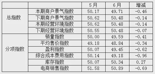 從商戶景氣指數來看,總指數中,6月商戶景氣指數為49.71,比5月的50.17下降0.46個百分點;經營環境指數為50.48,比5月的50.62下降0.14個百分點。