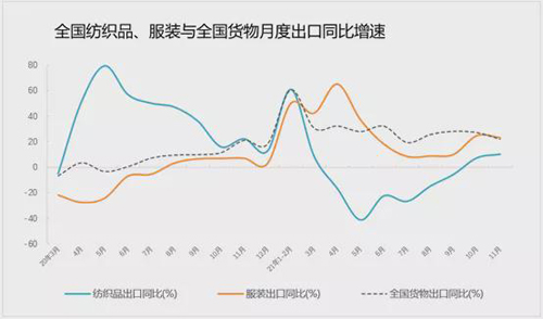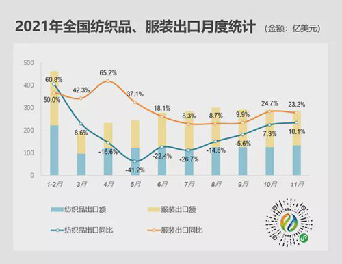 2021年11月當月,我國紡織品服裝出口286.6億美元,同比增長16.8%(以人民幣計同比增長11·6%)。其中,紡織品出口132.4億美元,同比增長10.1%(以人民幣計同比增長5·2%),保持上月以來的單月出口同比正增長態勢;服裝出口154.1億美元,同比增長23.2%(以人民幣計同比增長17·7%),高于全國貨物出口同比1.2個百分點。