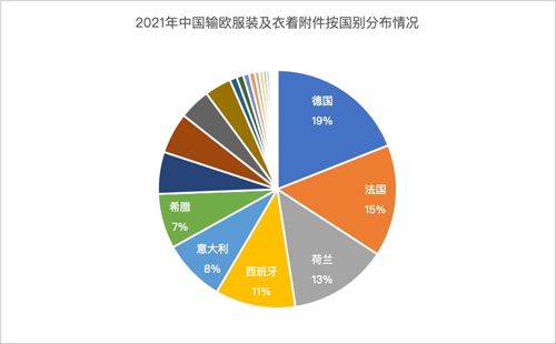 根據(jù)中國海關(guān)數(shù)據(jù)顯示,2021年中國向歐盟出口服裝及衣著附件產(chǎn)品超過320億美元,較2020年增加21%。出口前五位的國家分別為:德國19%, 法國15%, 荷蘭13%, 西班牙11%, 意大利8%。