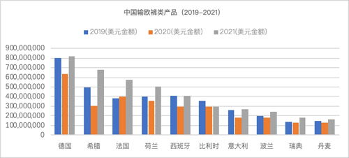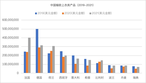 2021年歐洲從中國進口的上衣類產(chǎn)品總額超過20億美元,已經(jīng)恢復(fù)疫情前水平。法國從中國進口上衣產(chǎn)品較疫情前增長65.8%。