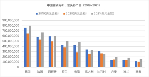 德國、法國、西班牙、荷蘭、意大利在內(nèi)歐洲主要國家從中國進口的毛衫、套頭衫產(chǎn)品已經(jīng)恢復(fù)到疫情前水平。2021年歐盟從中國進口毛衫產(chǎn)品達(dá)到43.9億美元,較2019年增長8.9%。2021年法國從中國進口毛衫6.68億美元,較2019年增長14.6%。