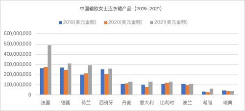 歐洲主要國家從中國進口的女士連衣裙產(chǎn)品超過疫情前水平。2021年該類產(chǎn)品從中國進口額達(dá)到20億美元,比疫情前增長31.4%。法國從中國進口連衣裙較疫情前增長86%。