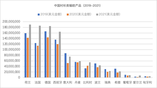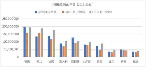 歐盟從中國進口T恤衫,略高于疫情前水平。2021年從中國進口總額11億美元,較2019年增長11.4%。其中,荷蘭,法國增幅分別為39%和26.5%。