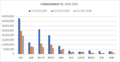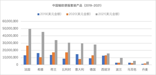 近兩年,歐洲市場對便服套裝的市場需求顯著。2021年,歐盟該產(chǎn)品從中國進口額為2.68億美元,是2019年進口額的2.4倍。其中,法國從中國進口該產(chǎn)品較疫情前增長2.8倍。