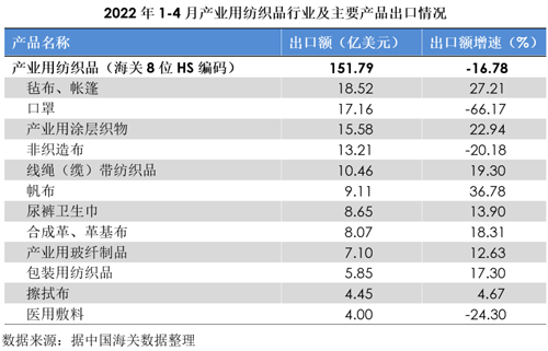 2022年1-4月,受疫情反復、結構成本上升等不利因素影響,產業用紡織品行業下行壓力加大,行業工業增加值繼續保持正增長,但增幅有所收窄。
