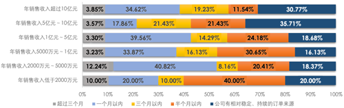 企業在手訂單方面,26.4%的受訪企業擁有相對穩定、持續的訂單來源或在手訂單能夠支持三個月以上的生產,而34.4%的受訪企業在手訂單僅能夠支撐企業一個月以內的生產。根據企業規模,大中型企業的在手訂單更加穩定、充足,能夠支持更長時間的生產;而小微企業的在手訂單大多只能夠支撐一個月以內甚至半個月以內的生產(圖2)。