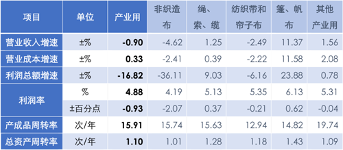 分領域看,1~6月規模以上非織造布企業的營業收入和利潤總額分別同比下降4.6%和36.1%,利潤率為4.2%,同比下降2.1個百分點;繩、索、纜規模以上企業的營業收入和利潤總額分別同比增長1.3%和9.0%,利潤率為5.1%,同比增加0.4個百分點;紡織帶、簾子布規模以上企業的營業收入和利潤總額分別同比下降2.5%和6.2%,利潤率為5.4%,同比下降0.2個百分點;篷、帆布行業發展勢頭良好,規模以上企業的營業收入和利潤總額分別同比增長11.4%和23.9%,利潤率為6.1%,同比增加0.6個百分點;過濾、土工用紡織品所在的其他產業用紡織品規模以上企業的營業收入和利潤總額雙雙恢復正增長,分別同比增加1.6%和0.8%,利潤率為5.3%,與2021年同期基本持平(表1)。