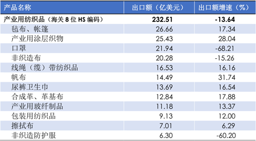 表2 2022年1~6月產業用紡織品行業及主要產品出口情況