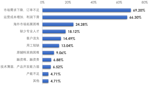 根據協會對會員企業的調研,市場需求下降和運營成本增加是當前受訪企業在經營過程中面臨的主要困難,海外市場拓展困難、缺少專業人才和客戶流失也是企業反映較多的問題,見表3。