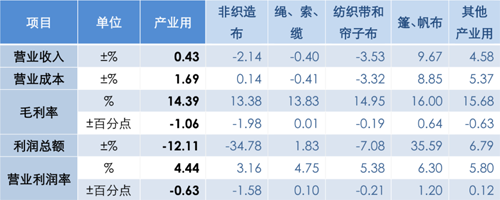 經(jīng)濟(jì)效益方面,1-9月產(chǎn)業(yè)用紡織品行業(yè)規(guī)模以上企業(yè)的營(yíng)業(yè)收入同比增長(zhǎng)0.4%,自1-2月以來再次恢復(fù)增勢(shì);利潤(rùn)總額同比下降12.1%,營(yíng)業(yè)利潤(rùn)率為4.4%,同比下降0.6個(gè)百分點(diǎn);行業(yè)虧損面為23.6%,虧損企業(yè)的虧損額同比增長(zhǎng)23.1%。當(dāng)前,原材料價(jià)格波動(dòng)、需求支撐不足、市場(chǎng)競(jìng)爭(zhēng)激烈等因素使行業(yè)的盈利能力仍然面臨挑戰(zhàn)。