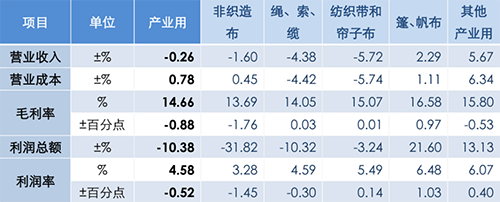 經(jīng)濟(jì)效益方面,1-11月產(chǎn)業(yè)用紡織品行業(yè)規(guī)模以上企業(yè)的營(yíng)業(yè)收入和利潤(rùn)總額分別同比下降0.3%和10.4%,利潤(rùn)率為4.6%,同比下降0.5個(gè)百分點(diǎn)。分領(lǐng)域看,1-11月非織造布規(guī)模以上企業(yè)的營(yíng)業(yè)收入和利潤(rùn)總額分別同比下降1.6%和31.8%,利潤(rùn)率為3.3%,同比下降1.5個(gè)百分點(diǎn);繩、索、纜規(guī)模以上企業(yè)的營(yíng)業(yè)收入和利潤(rùn)總額分別同比下降4.4%和10.3%,利潤(rùn)率為4.6%,同比下降0.3個(gè)百分點(diǎn);紡織帶、簾子布規(guī)模以上企業(yè)的營(yíng)業(yè)收入和利潤(rùn)總額分別同比下降5.7%和3.2%,利潤(rùn)率為5.5%,同比增長(zhǎng)0.1個(gè)百分點(diǎn);篷、帆布規(guī)模以上企業(yè)的營(yíng)業(yè)收入和利潤(rùn)總額分別同比增長(zhǎng)2.3%和21.6%,6.5%的利潤(rùn)率為行業(yè)最高水平;過(guò)濾、土工用紡織品所在的其他產(chǎn)業(yè)用紡織品規(guī)模以上企業(yè)的營(yíng)業(yè)收入和利潤(rùn)總額分別同比增長(zhǎng)5.7%和13.1%,利潤(rùn)率為6.1%,同比增長(zhǎng)0.4個(gè)百分點(diǎn)。