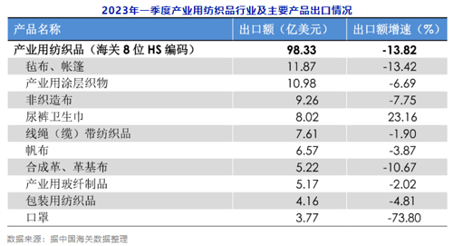 國際貿(mào)易方面,根據(jù)中國海關(guān)數(shù)據(jù),2023年一季度我國產(chǎn)業(yè)用紡織品行業(yè)的出口額(海關(guān)8位HS編碼統(tǒng)計數(shù)據(jù))為98.3億美元,同比下降13.8%;一季度行業(yè)進口額(海關(guān)8位HS編碼統(tǒng)計數(shù)據(jù))為12.3億美元,同比下降17.7%。分產(chǎn)品來看,在出口前十的產(chǎn)品中,氈布/帳篷和產(chǎn)業(yè)用涂層織物的出口額均超過10億美元;非織造布出口量為29.3萬噸,同比下降2.8%,價值9.3億美元,同比下降7.8%;一次性衛(wèi)生用品的海外需求持續(xù)旺盛,出口額為8億美元,同比增長23.2%;線繩(纜)帶紡織品、帆布、革基布等傳統(tǒng)產(chǎn)品的需求轉(zhuǎn)弱,出口額分別同比下降1.9%、3.9%、10.7%;口罩與化纖非織造布制防護服(含醫(yī)用防護服)的出口額分別同比下降73.8%和32.2%。